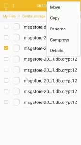 ۷ .در این مرحله بسیار دقت کنید .فایل msgstore.DB.cryptXX را پیدا کنید و نام آن رادقیقا به msgstore.dbBACKUP.cryptXX تغییردهید.(همانند تصویر زیر)